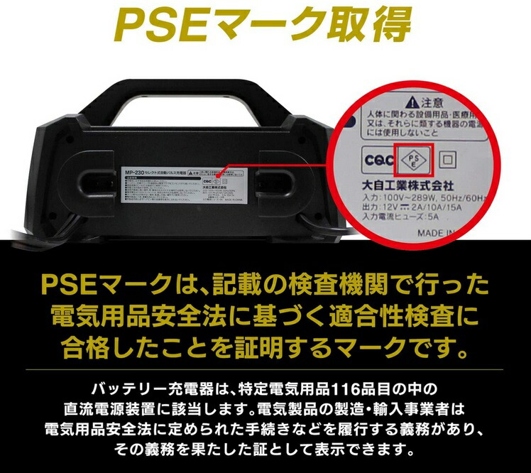 ![]() ![]() 定格入力:AC100V 50/60Hz 215W 定格出力:DC12V/12A(最大電流) 適合バッテリー:DC12V(開放型・密閉型)鉛バッテリー 適合バッテリー容量:6Ah~140Ah 充電方式:定電流定電圧/オート充電方式 特徴 ●パルス充電でサルフェーションを除去しバッテリーのパワーを復活させる。 ●車のバッテリーを外さず繋いでコンセントを差し込むだけで誰にでも簡単充電 ●バイク~ミニバン・小型船舶・大型トラックに対応 ●バッテリー接続時火花がでない安全仕様 ●充電完了後も長期つなぎっぱなしや自然放電も自動検知し最善の充電を行い過充電の心配なしのトリクルパルス充電 ●全自動充電でバッテリーの容量や状況に応じて電流を流し、2A・8A・12Aと3つの充電電流もセレクトにて選べる ●2段階のバッテリー診断で充電初期段階で充電可、不可を診断し 充電後半にてバッテリーの充電状態を分析しバッテリーをきっちり診断でバッテリー不良を見逃さない ●ダブルパルス充電で劣化したバッテリーを長寿命にする。 ●6つの保護回路(逆接続・バッテリー不良・電圧確認・過電流・高温・タイムオーバー)で安全・安心 使用上の注意 ●本製品をご使用前に取扱説明書をよく読み十分に理解された上で使用してください。 取扱説明書には重要事項の説明が記載されています。 記載内容に従わず使用した場合、重大な事故につながります。 ●タバコなど火の気がないところ、風通しの良い所でご使用ください。 火の気の近くや風通しが悪いと、バッテリーが過熱、爆発することがあります。 ●バッテリーの温度が体温より温かい時は、冷ましてから充電を開始してください。 本製品が過熱、発火したり、バッテリーの液もれ、過熱、爆発の原因となることがあります。 ●子供、乳幼児にはてをふれさせないよう注意してください。けがや感電することがあります。 ●木くず、可燃性オイルなど可燃物の周辺で使用しないでください。 万が一引火した場合、傘の原因となることがあります。 ●バッテリー充電クリップの接続は、次の手順で極性に注意して行ってください。 充電器側+赤クリップ→バッテリー側+端子 充電器側-黒クリップ→バッテリー側-端子 確実に接続しなかったり、極性を間違えて接続した場合には本製品が過熱・発火し たり、 バッテリーが過熱、爆発する原因となることがあります。 ●充電中にバッテリー充電クリップを取り外さないでください。車両火災、感電、爆発の原因となることがあります。 ●直射日光課下や発熱体の近辺など高温の場所、湿度の極端に高い場所、 雨、雪等の水分のかかる場所、ほこりの多い場所や化学性ガスの被害をうけやすい場所では使用、 保管はしないでください。漏電、感電、過熱、爆発、故障の原因となることがあります。 ●以下のバッテリーには充電しないでください。ニッカドバッテリー、ニッケル水素バッテリー、 リチウムバッテリー、一次電池(アルカリ・ニッカド)、乾電池等 ![]() ![]() 保証書への捺印はご希望の方のみにさせて頂いております。 捺印がない場合も、保証期間内であればご注文履歴に基づきメーカー保証の対応は可能でございます。 保証書に捺印済みの商品に関しましてはお客様のご都合による返品および交換の対応出来かねますので 保証書捺印をご希望される場合は予めご了承ください。 ![]() ご希望のお客様のみに発行をしております。 ご希望の際はご注文時の備考欄へご入力ください。 領収書については『WEB領収書』を発行致しまして、 送らせて頂きますメールよりダウンロードをして頂く形になります。 宛名および但し書きの指定や、紙ベースでの発行をご希望の場合はその旨もご入力をお願い致します。 |